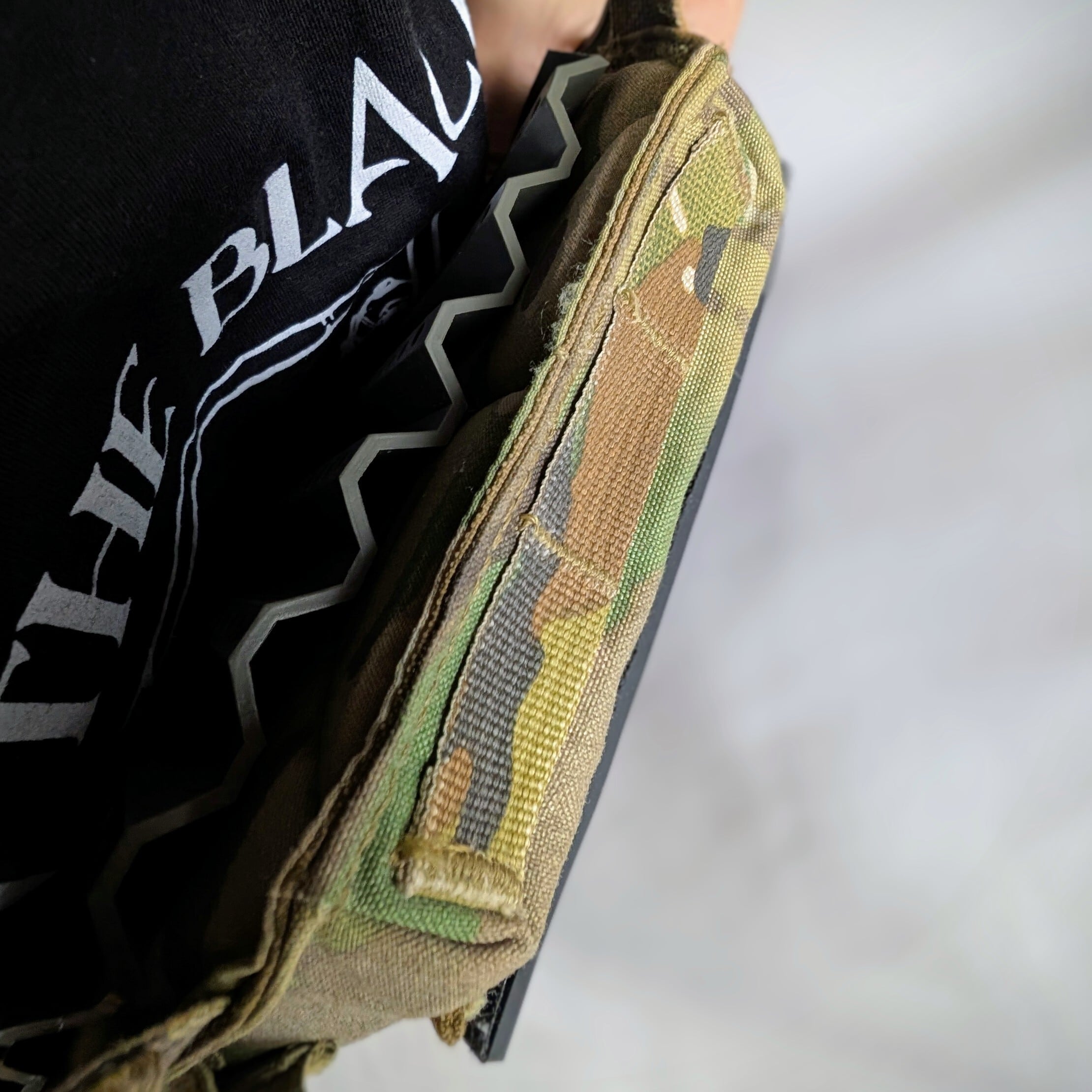 着脱はベルクロで簡単にでき、本体にはフックがしっかりと縫い付けられています。また、アーマーキャリア側に貼り付ける粘着性ベルクロのループも付属しています。